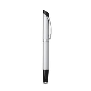 Descrição: Caneta metálica triangular com tampa, carga esferográfica azul.