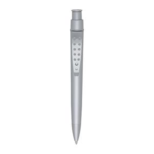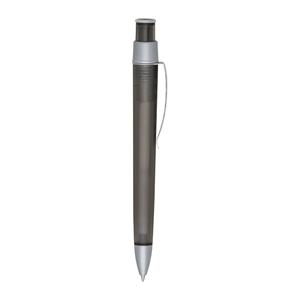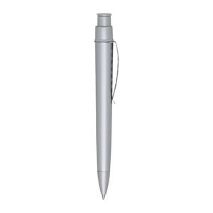 Descrição: Caneta plástica com clip metálico vazado, carga esferográfica azul e acionamento por clique.