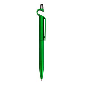 Descrição: Caneta plástica com suporte para celular e touch screen. Carga esferográfica azul e acionamento por rotação.