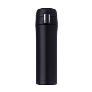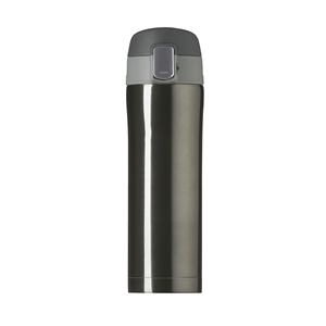 Descrição: Garrafa térmica de 450ml de metal inteira colorida com botão de abertura prata. Possui um sistema de trava com desenho indicativo de cadeados(aberto e fechado), ao levantar o botão pequeno basta pressionar o botão central maior para abrir a tam
