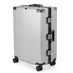 Descrição: Mala de viagem 78 litros feita em plástico com acabamento em alumínio, contém cadeado numérico TSA. Compartimentos internos com bolso telado, bolso plástico para itens molhados e cinta compressora para roupas. A mala possui duas alças de mãos,