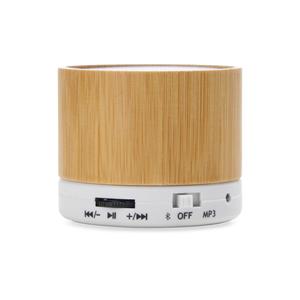 Descrição: Caixa de som multimídia com Bluetooth e entrada para cartão TF. Material plástico com acabamento em bambu, possui a parte inferior com detalhes em relevo de algumas funções: botão Off/On; entrada para cartão MicroSD. Parte inferior com detalhe